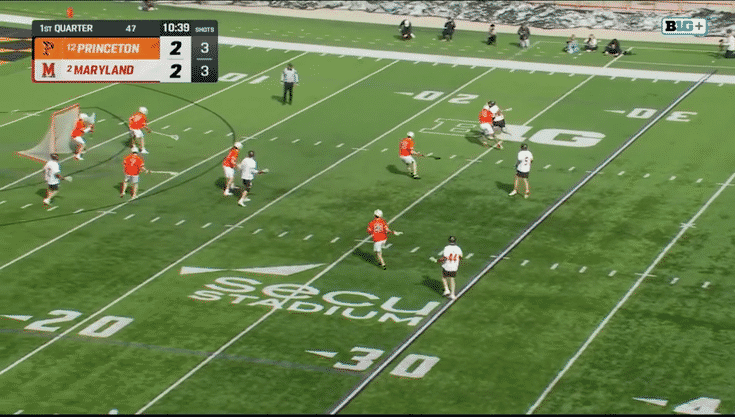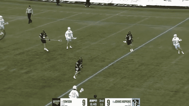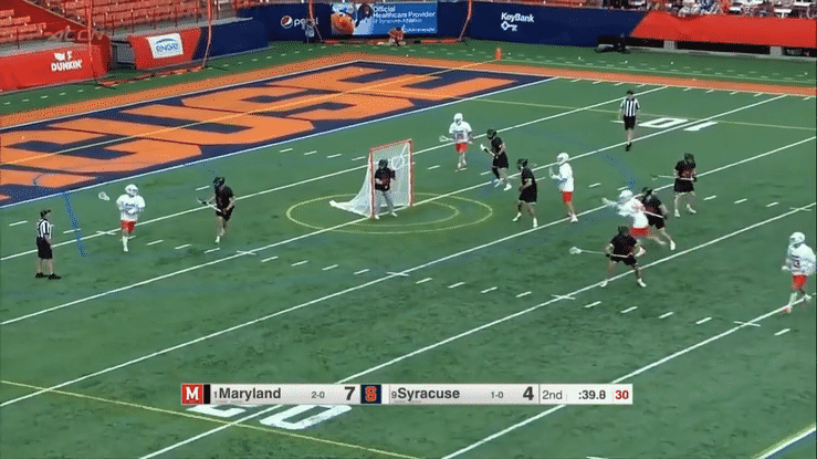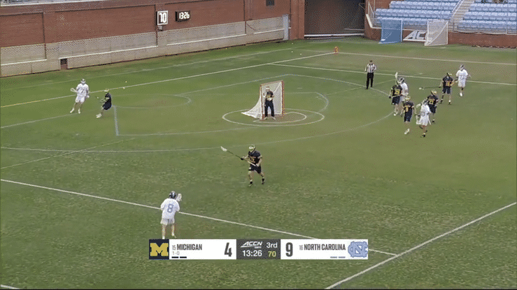 Here the Michigan X defender looks to plug to the middle, and his attackman cuts to the back pipe.