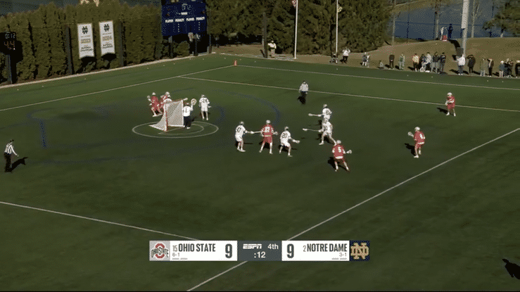 Watch the ND defender's helmet. The moment he looks at the ball, the attacker cuts to the "front" side for the game-winner.