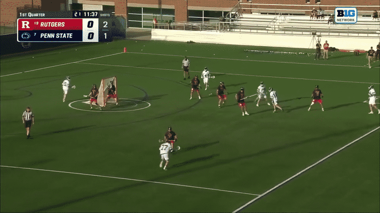 The Penn State attackman notices his man looking to show on the ball-side, and he gets to the back pipe above GLE and scores an easy goal.